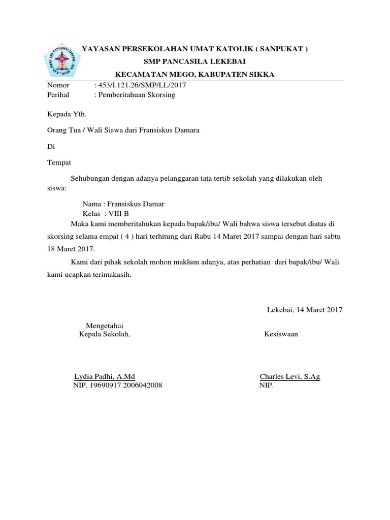 Contoh tanggung jawab sebagai siswa di sekolah penilaian ujian praktek mata pelajaran tata boga. Wali murid dari wesly adestomi. Contoh surat pemberitahuan skorsing siswa atau peserta didik kop sekolah nomor. Makalah pkbm paket b. Dalam menulis surat skorsing karyawan ini selalu pastikan identitas karyawan seperti nama nomor induk karyawan jabatan dan serta alasan karyawan tersebut dikenakan skorsing adalah benar dan alasannya bisa dibuktikan. Surat pengembalian siswa kepada orang tua.