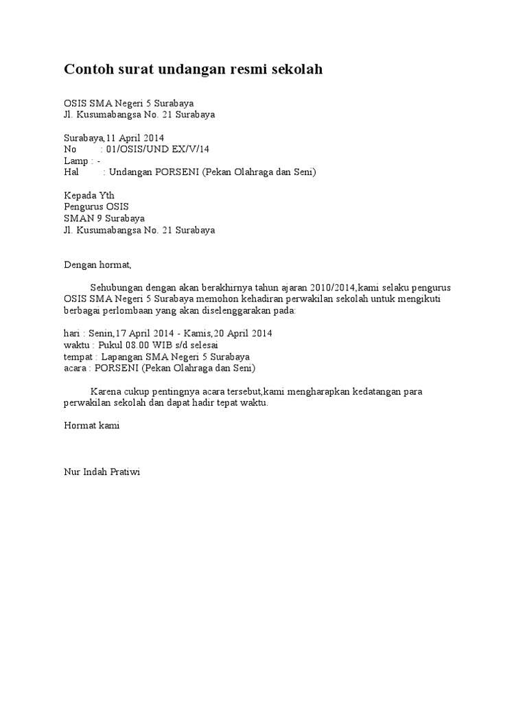 Contoh surat undangan resmi osis. Penggunaan surat resmi sekolah merupakan hal yang wajib bagi sekolah sebagai salah satu lembaga pendidikan. Karena undangan rapat osis merupakan salah satu surat resmi anda tentu saja harus mengikuti beberapa kaidah dalam pembuatan surat resmi. 7 contoh surat undangan rapat resmi perusahaan osis rt karang taruna utari ida oesman 04092017 30102017 contoh surat undangan rapat surat undangan rapat termasuk kedalam jenis surat resmi karena di dalamnya terdapat kop surat dan stempel. Dan seperti pada surat resmi pada umumnya surat resmi osis juga didalamnya harus memakai bahasa resmi yang baik baku dan bahasa yang sesuai eyd bahasanya singkat jelas dan padat serta terdapat nomor surat kop surat lembaga organisasi yang membuatnya tanda tangan serta cap basah. 15 contoh surat resmi sekolah yang baik dan benar setiap komunikasi sekolah yang bersifat resmi biasanya akan menggunakan surat sebagai alat komunikasinya. Surat resmi osis merupakan surat resmi yang dibuat dan dikeluarkan oleh osis.