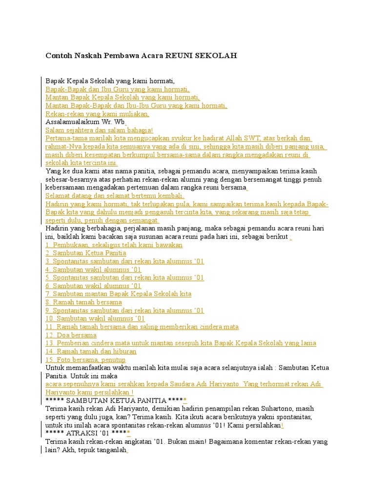 Contoh naskah pembawa acara reuni sekolah bapak kepala sekolah yang kami hormati bapak bapak dan ibu guru yang kami hormati. Ketua panitia reuni akbar sma negeri 40 jakarta ketua iluni sma negeri 40 jakarta selingan hiburantari bpkkepala sekolah sma negeri 40 jakarta perwakilan guru sma negeri 40 jakarta pembagian hadiah kenangan untuk para guru selingan hiburan bandtari acara ramah tamah diselingi beberapa hiburanutama band. Jadi nanti pada nebak nebakin ini siapa dan itu siapa pas wajah mereka semua masih jaman dulu. Susunan acara reuni di sini dapat anda jadikan referensi dan anda terapkan di acara reuni untuk sekolah dasar menengah ataupun sma. Jadi gamesnya begini gannanti di acara reuninya masing masing peserta di harapkan bawa foto jadul atau panitia menyiapkan foto foto jadul yang nantinya bakal di jadikan quiz tebak wajah. Hadirin yang berbahagia perjalanan masih panjang maka sebagai pemandu acara reuni hari ini baiklah kami bacakan saja susunan acara reuni pada hari ini sebagai berikut.