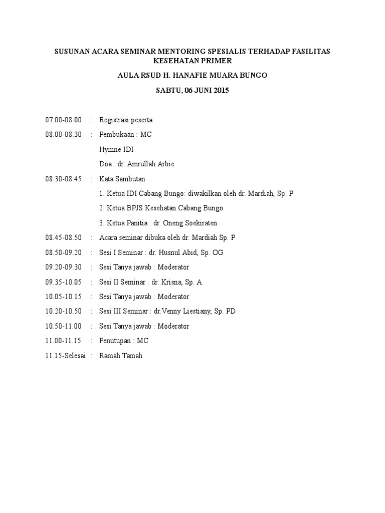Contoh susunan acara seminar kesehatan. Demikianlah susunan pengenai rundown acara seminar yang bisa kalian dapatkan pembahasan ini bisa berubah ubah sesuai dengan baimana acara pelaksanaan seminar. Demikian seminar nasional hari inimarilah kita tutup acara ini bersama sama dengan membaca hamdallah. Namun susunan acara itu disesuiakan dengan jenis acara yang diadakan dengan menambahkan susunan acara yang dirasa perlu. Contoh teks naskah pembukaan oleh pembawa acara mc. Tapi karena sudah tugas ya mau tidak mau jadi terpaksa belajar. Berikut susunan acara dan naskah mc nya.