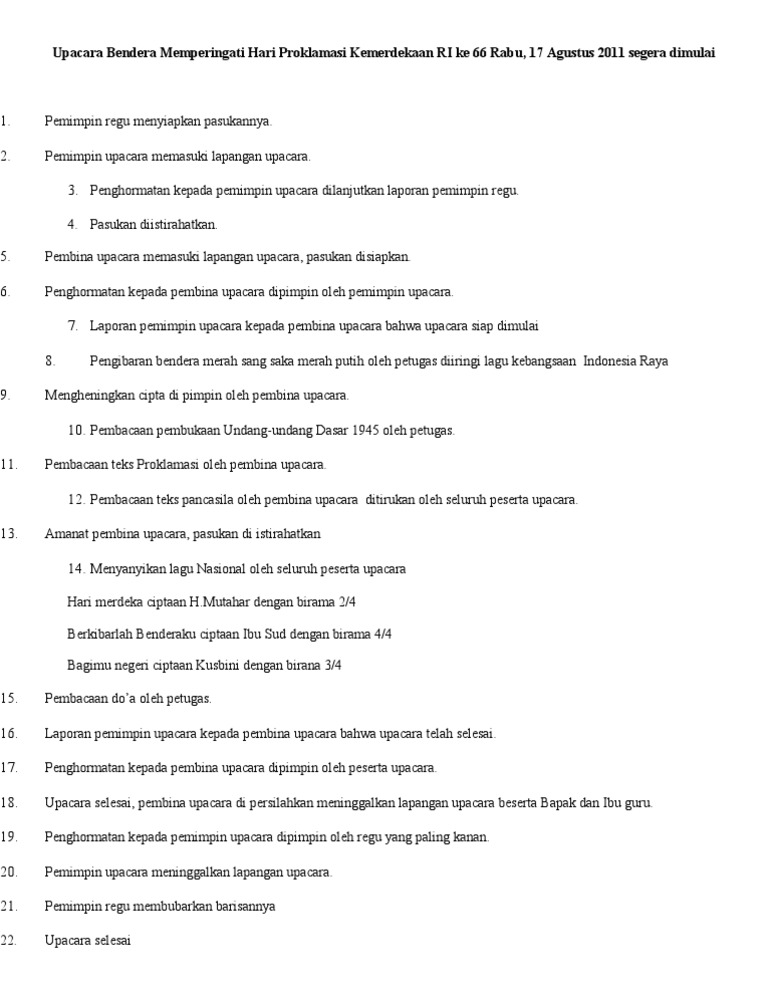 Berikut adalah contoh susunan acara upacara untuk 17 agusutus. Sebaiknya khususnya jika acara agustusannya dilakukan tepat tanggal 17 agustus acara dibuka dengan seremonial misalnya menyanyikan lagu indonesia raya sambil menaikkan bendera merah putih. Contoh susunan acara mc upacara hut kemerdekaan ri dan persiapannya 8817 bahasa bahasa indonesia edit inirumahpintar dalam memperingati hari kemerdekaan republik indonesia seluruh instansi pemerintah serempak melakukan upacara pengibaran bendera merah putih di lapangan. Persiapan para panitia jauh jauh hari sudah dilaksanakan mulai dari perlombaan pentas seni sampai dengan acara puncaknya yaitu upacara bendera. 50 ungkapan kata kata hari kemerdekaan 17 agustus disertai gambar. Semoga dengan adanya contoh susunan acara dalam upacara pembacaan proklamasi kemerdekaan 17 agustus di atas dapat menjadi inspirasi bagi mu dalam pembuatannya.