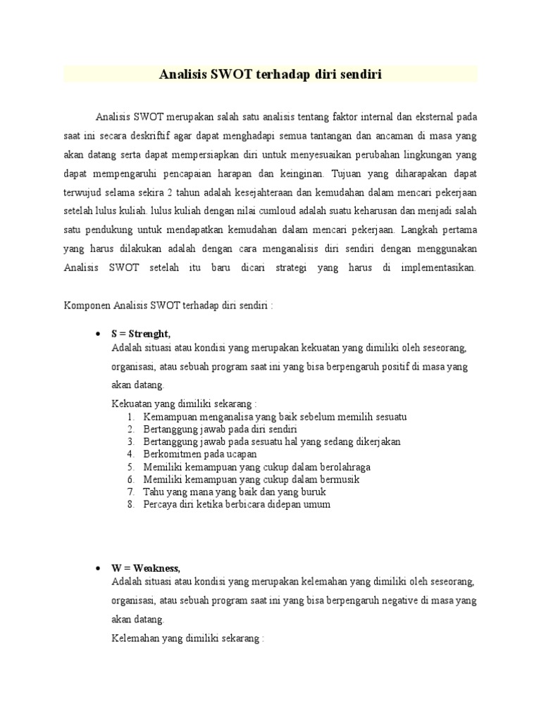 Contoh swot diri sendiri sebagai mahasiswa. Contoh dari analisis swot. Contoh analisis swot diri sendiri. 1 contoh analisis swot diri sendiri. Dalam diri sendiri memang perlu adanya analisis hal tersebut memang sangat penting untuk mengetahui dengan perekmbangan yang terletak pada dirinya untuk menjadi yang terbaik. Analisis swot pada diri sendiri analisis swot merupakan salah satu analisis tentang factor internal dan eksternal pada saat ini secara deskriftif agar dapat menghadapi semua tantangan dan ancaman di masa yang akan datang serta dapat mempersiapkan diri untuk menyesuaikan perubahan lingkungan yang dapat mempengaruhi pencapaian harapan dan keinginan. Terdapat dua faktor yang dapat memengaruhi analisis swot yaitu faktor internal dan faktor external.