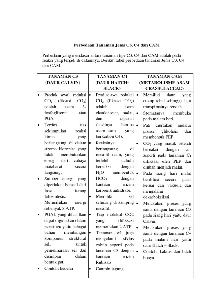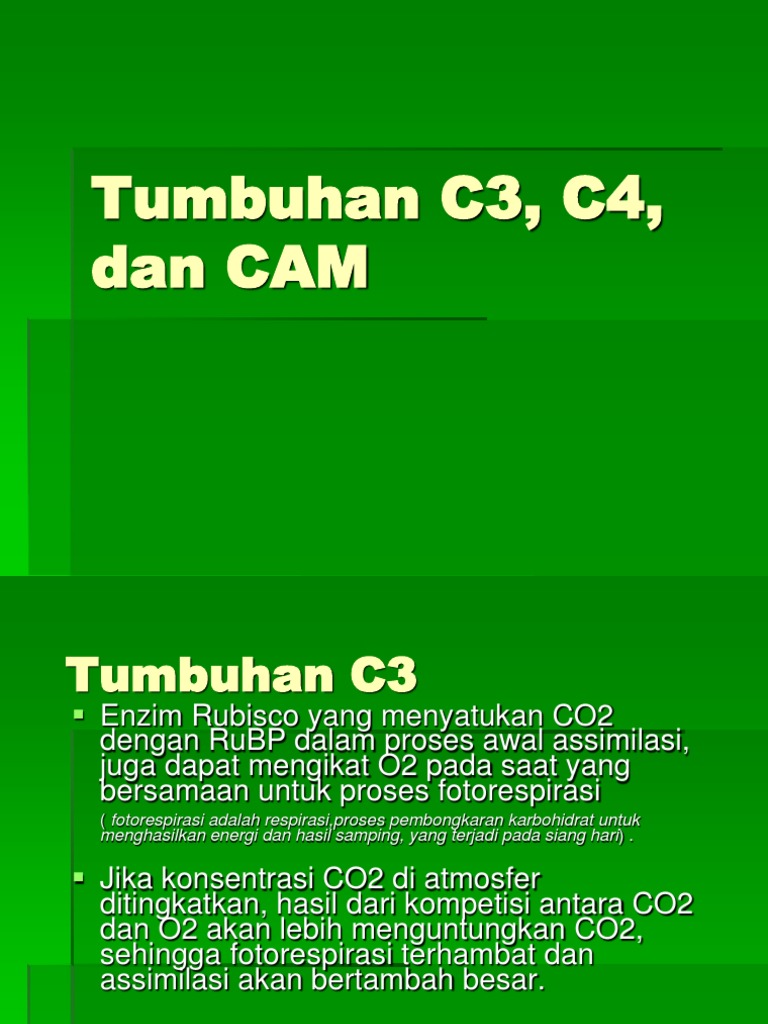 Tumbuhan cam adalah tumbuhan yang dapat berubah seperti tumbuhan c3 pada saat pagi hari suhu rendah dan dapat berubah seperti tumbuhan c4 pada siang hari dan malam hari gardner 1991. Pada siklus tersebut co 2 akan diikat oleh ribulosabifosfat rubp dan membentuk asam fosfogliserat pga yang merupakan senyawa 3 c. Akan tetapi tanaman c4 lebih mudah beradaptasi di lahan yang memiliki kadar co2 tinggi. Dibandingkan c3 tanaman c4 dan cam bersifat lebih adaptif pada daerah yang kering dan panas. Tanaman c3 c4 dan cam. Tumbuhantanaman c3 adalah tumbuhan yang mendominasi sebagian besar di bumi 85 dengan melakukan fotosintesis secara standar.