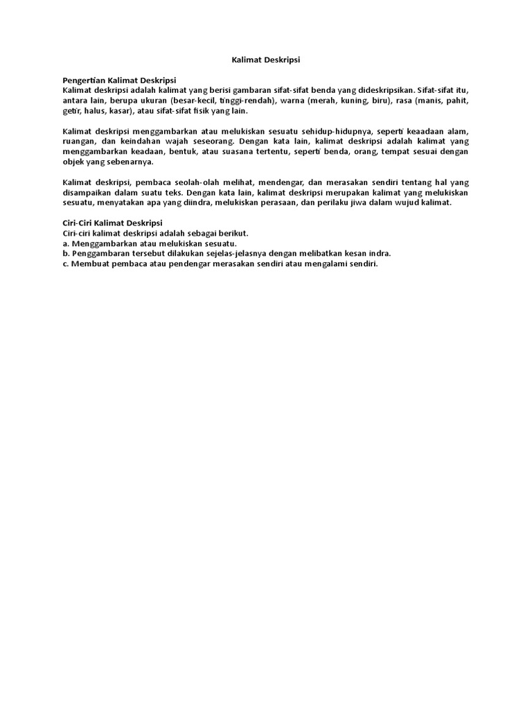 Silahkan kalian simak penjelasan lengkapnya dibawah ini. Teks deskripsi merupakan sebuah teks atau paragraf yang detail dan jelas berisi tentang gambaran gagasan utama baik. Itulah beberapa pengetahuan mengenai teks deskripsi contoh teks deskripsi cara membuat bahkan kaidah kebahasaannya. Pada saat berada di puncak gunung keinginan yang biasanya muncul adalah keinginan untuk melihat keindahan sunrise. Teks deskripsi membuat pembaca seolah masuk ke dalam suasana. Teks deskripsi pembahasan materi kali ini adalah mengenai pengertian contoh struktur tujuan dan ciri ciri teks deskripsi yang akan dibahas secara lengkap.