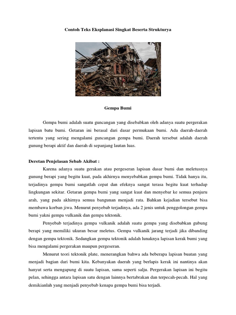 Teks eksplanasi biasanya menjadi bahan pelajaran bahasa indonesia yang diberikan pada siswa kelas vii pada kurikulum 2013. Pengertian ciri ciri struktur teks eksplanasi. Beberapa bencana alam yang kami singgung diatas akan kami jelaskan secara terperinci dalam bentuk contoh teks eksplanasi singkat beserta strukturnya. Contoh teks eksplanasi setelah kita mengetahui masing masing penjelasan mengenai berbagai teks diartikel sebelumnya. Berikut ini terdapat beberapa contoh teks eksplanasi antara lain sebagai berikut.