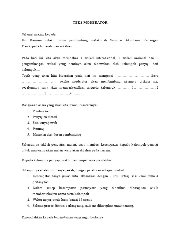 Yang terhormat penyaji materi. Yang terhormat ibu euis nursaadah mpd. Panduan praktis cara menjadi moderator seminar yang baik konten dan cara penyampaian december 19 2015 november 22 2019 jika sebelum sebelumnya hampir sebagian besar ulasan di situs ini lebih banyak membahas tentang cara menjadi seorang presenter atau pembicara maka pada kesempatan ini saya akan membahas hal yang sedikit berbeda. Contoh kata kata moderator yang baik unknown 2012 06 02t0300000800 50 stars based on 35 reviews pembukaan tugas pertama moderator adalah membuka jalannya presentasi diskusi seminar lokakarya. Contoh naskah moderator friday august 05 2016 contoh text moderator praktek menjadi seorang moderator sma stella duce 2 yogyakarta selamat siang dan salam sejahtera bagi kita semua. Teks moderator seminar dan contoh paragraf teks seminar singkat.