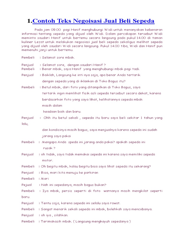 Beli pisang di pasar. 15 contoh teks negosiasi jual beli singkat dalam berbagai kasus didalam sebuah obrolan terdapat istilah negosiasi antar personal dan hal yang dinegosiasikanpun bermacam macam dari yang terlihat sepele hingga serius atau yang formal ataupun yang tidak formal serta negosiasipun bisa dilakukan via pesan text pada sosial media atau via telfon dan bahkan secara langsung. Nah tak perlu berlama lama lagi berikut ini selengkapnya 6 contoh teks negosiasi tersebut. Contoh teks negosiasi jual beli beserta strukturnya negosiasi merupakan sebuah interaksi yang terjadi antara dua pihak yang mana pihak pihak yang terlibat memiliki tujuan untuk mencapai sebuah kesepakatan. Di dalam contoh teks negosiasi jual beli sayuran tomat di pasar tradisional ini ada 3 tigaa orang yang menjadi tokoh dalam dialog yaitu penjual sayuran dan 2 dua calon pembeli. Untuk lebih jelasnya tentang hal hal apa saja yang akan di bahas tentang teks negosiasi beserta ke tujuh belas lebih contohnya kamu bisa melihatnya dalam daftar isi.