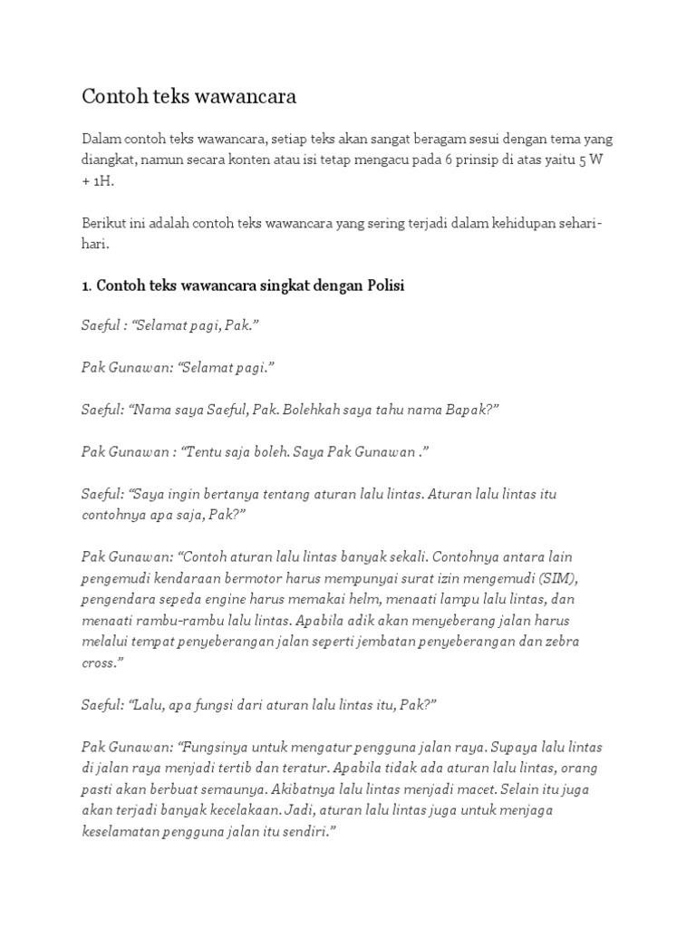 Dalam contoh teks wawancara setiap teks akan sangat beragam sesui dengan tema yang diangkat namun secara konten atau isi tetap mengacu pada 6 prinsip di atas yaitu 5 w 1h. Akan tetapi isinya tetaplah harus mengacu pada prinsip diatas yakni 6 prinsip 5w1h. Tujuan dari wawancara yaitu untuk mendapatkan informasi yang tepat dan aktual dari narasumber yang tepercaya. Contoh teks wawancara singkat dengan polisi. Kali ini kita akan membahas mengenai wawancara dimana disini kita akan bahas tentang pengertian tentang teks wawancara dan 3 contoh teks hasil wawancara singkat atau pendek terbaru 2017 dengan guru tentang pendidikan. Teks wawancara adalah teks yang menggambarkan kegiatan percakapan reportasi yang dilakukan pewawancara dengan narasumber.