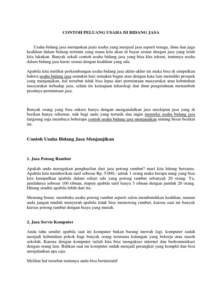 Contoh usaha dibidang jasa. Usaha jasa yaitu perjuangan yang hanya menjual jasa tertentu ibarat tenaga maupun ilmu serta keahlian dibidang tertentu dan kemudian si penjual jasa akan mendapat imbalan sesuai dengan bentuk jasa yang telah diberikansalah satu contoh perjuangan yang bergerak dibidang jasa yaitu jasa gadai bpkbkarena mereka tidak menjual barangyang mereka jual yaitu layanan derma uang. Di awal awal mereka membuka usaha di bidang jasa bisnis konsultan arsitek ini jasa yang mereka tawarkan lengkap. Namun ternyata pasar tidak merespon dengan jasa yang mereka tawarkan. Demikianlah penjelasan mengenai contoh peluang usaha di bidang jasa kreatif macam dan jenis ide bisnis yang menguntungkan dan menjanjikan tentunya. Karena usaha yang saya jalankan bergerak dalam bidang jasa maka yang kami hasilkan bukan berupa produk barang tapi dalam pelayanan yang memuaskan bagi pelanggankami sadar benar bahwa mendapatkan kepercayaan seorang pelanggan lebih pentingkarena walaupun hanya seorang pelanggan kalau kita memberikan pelayanan yang terbaik maka pelanggan tersebut juga akan memberi dampak positif pada diri kita. 20 peluang usaha franchise terlaris potensi untung fantastis.