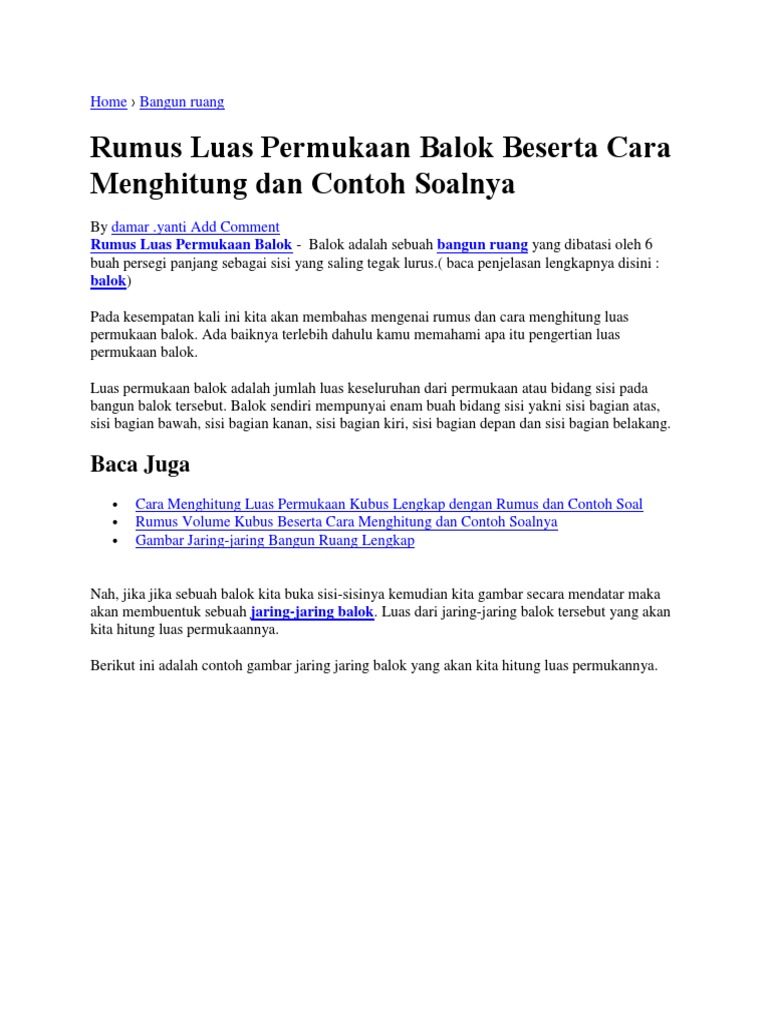 Rumus volume balok dan contoh soal. Contoh 4 soal cerita rumus balok. Balok merupakan bangun ruang yang dibatasi oleh tiga pasang sisi sejajar yang berbentuk persegi atau persegi panjang dengan setidaknya terdapat satu pasang sisi sejajar yang memiliki ukuran yang berbeda. Rumus menghitung volume balok dan contoh soalnya lengkap balok adalah salah satu bangun ruang yang memiliki bentuk persegi panjang dengan beberapa rusuk dan bidang sisinyasebagaimana bangun tabung atau yang lainnya balok ini juga memiliki volume yang kita perlu tahu bagaimana cara menghitungnya. Beberapa informasi mengenai balok yaitu. Rumus luas permukaan balok sebuah bangun ruang yang dibatasi 6 buah persegi panjang sebagai sisi dan saling tegak lurus disebut dengan balok. Jadi sebelum anda lanjut memahami contoh soal dan pembahasan volume balok ini alangkah baiknya anda memahami terlebih dahulu konsep volume balok.